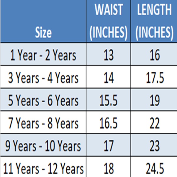 | Kids Sizes | 1 Year – 2 Years, 3 Years – 4 Years, 5 Years – 6 Years, 7 Years – 8 Years, 9 Years – 10 Years, 11 Years – 12 Years |