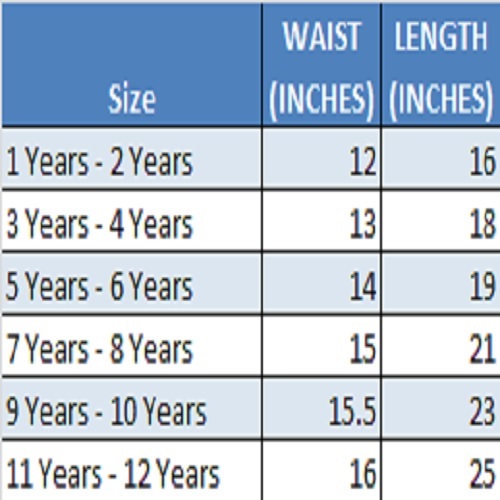 | Kids Sizes | 1 Year – 2 Years, 3 Years – 4 Years, 5 Years – 6 Years, 7 Years – 8 Years, 9 Years – 10 Years, 11 Years – 12 Years |